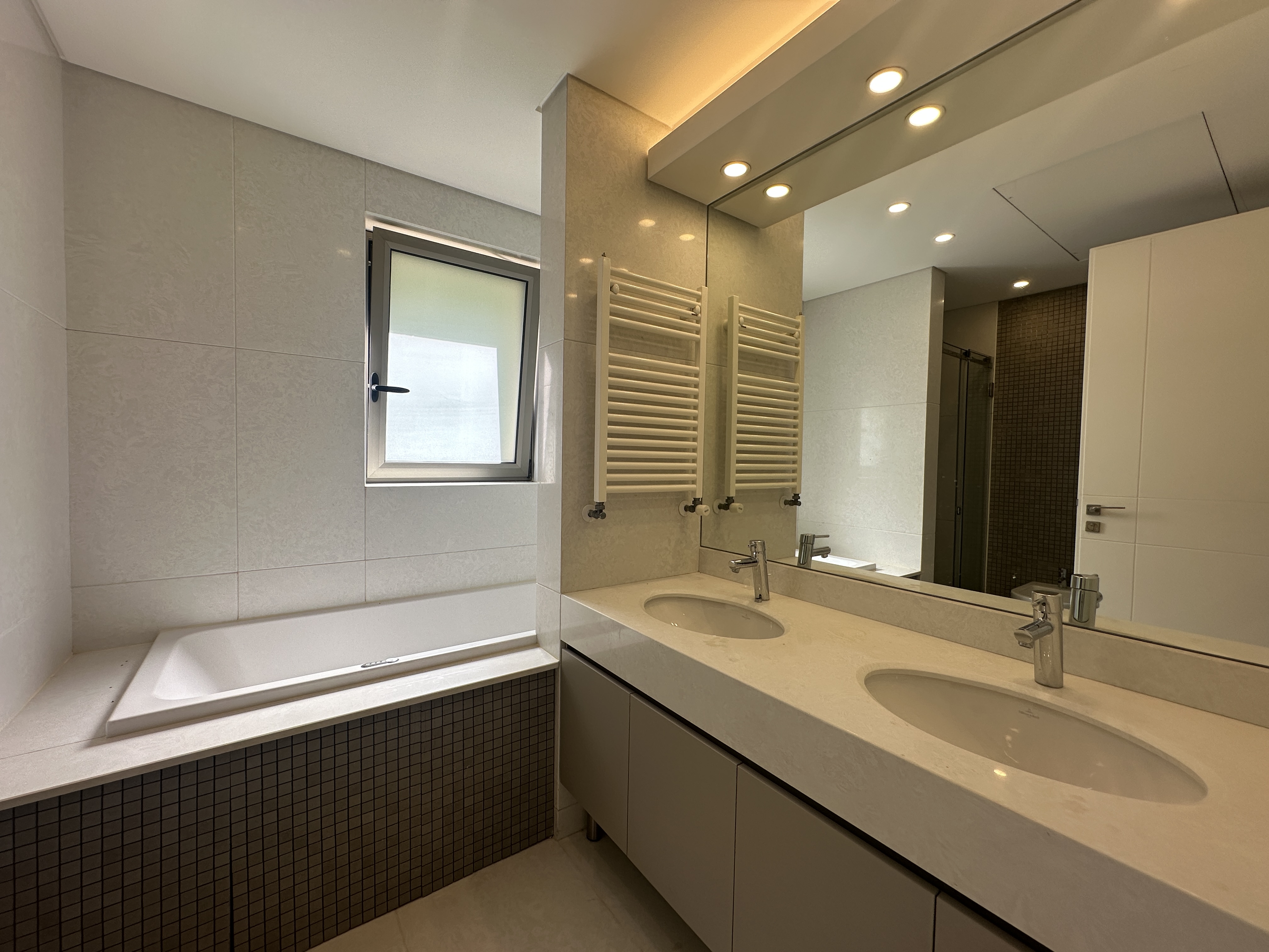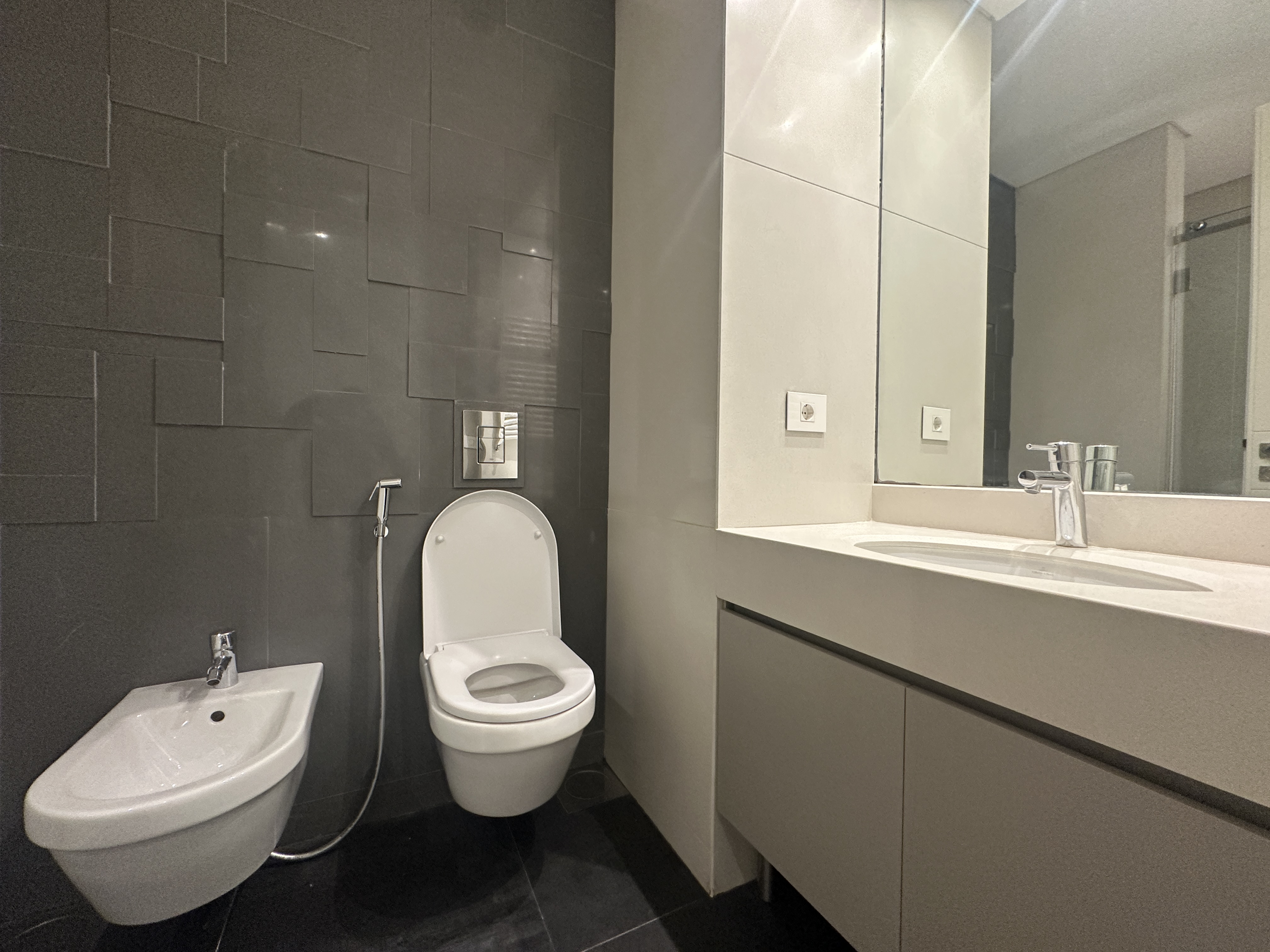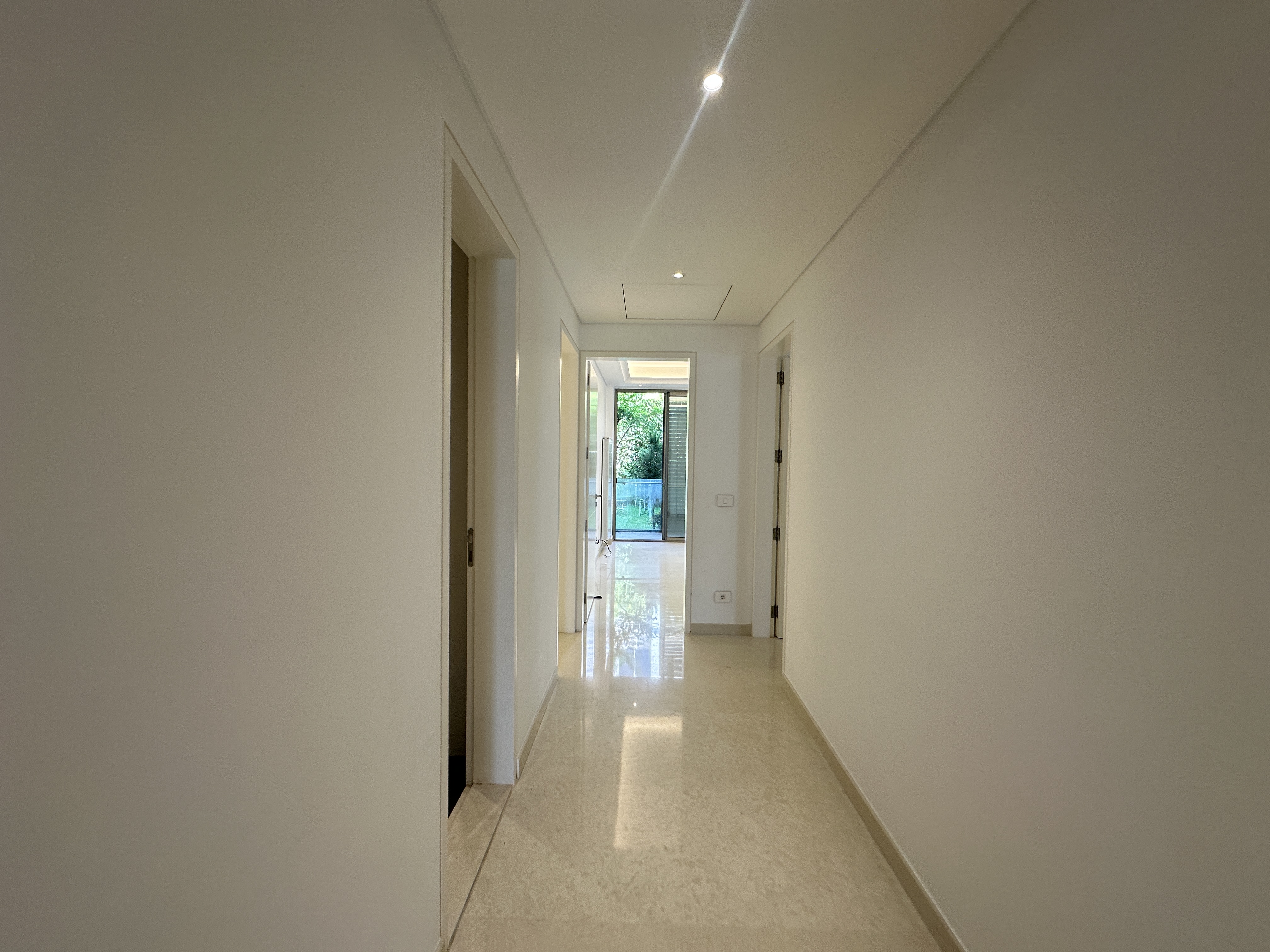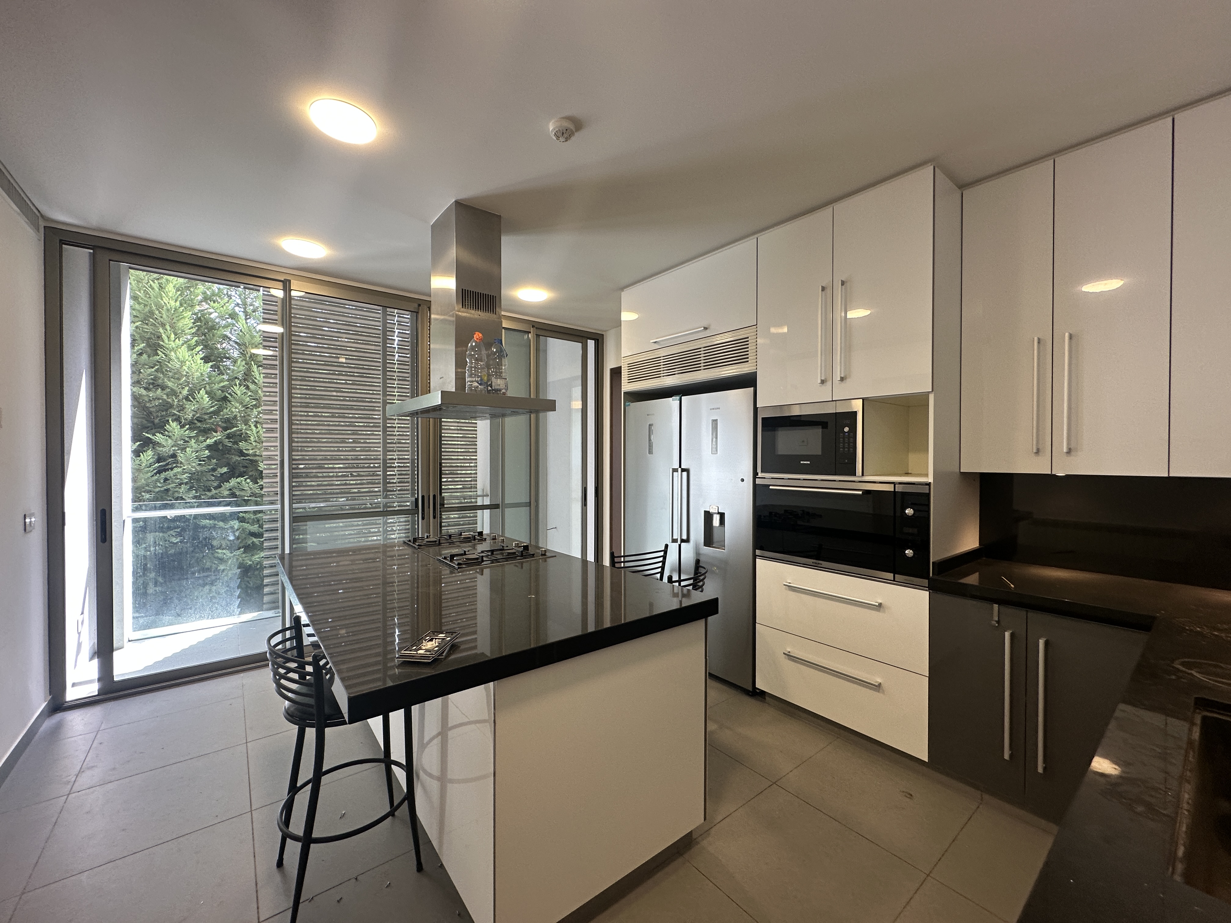 The apartment includes three bedrooms, a fully equipped kitchen, maid’s room, storage room, and two private parking spaces. There is also a common driver’s room and common garden for the building.