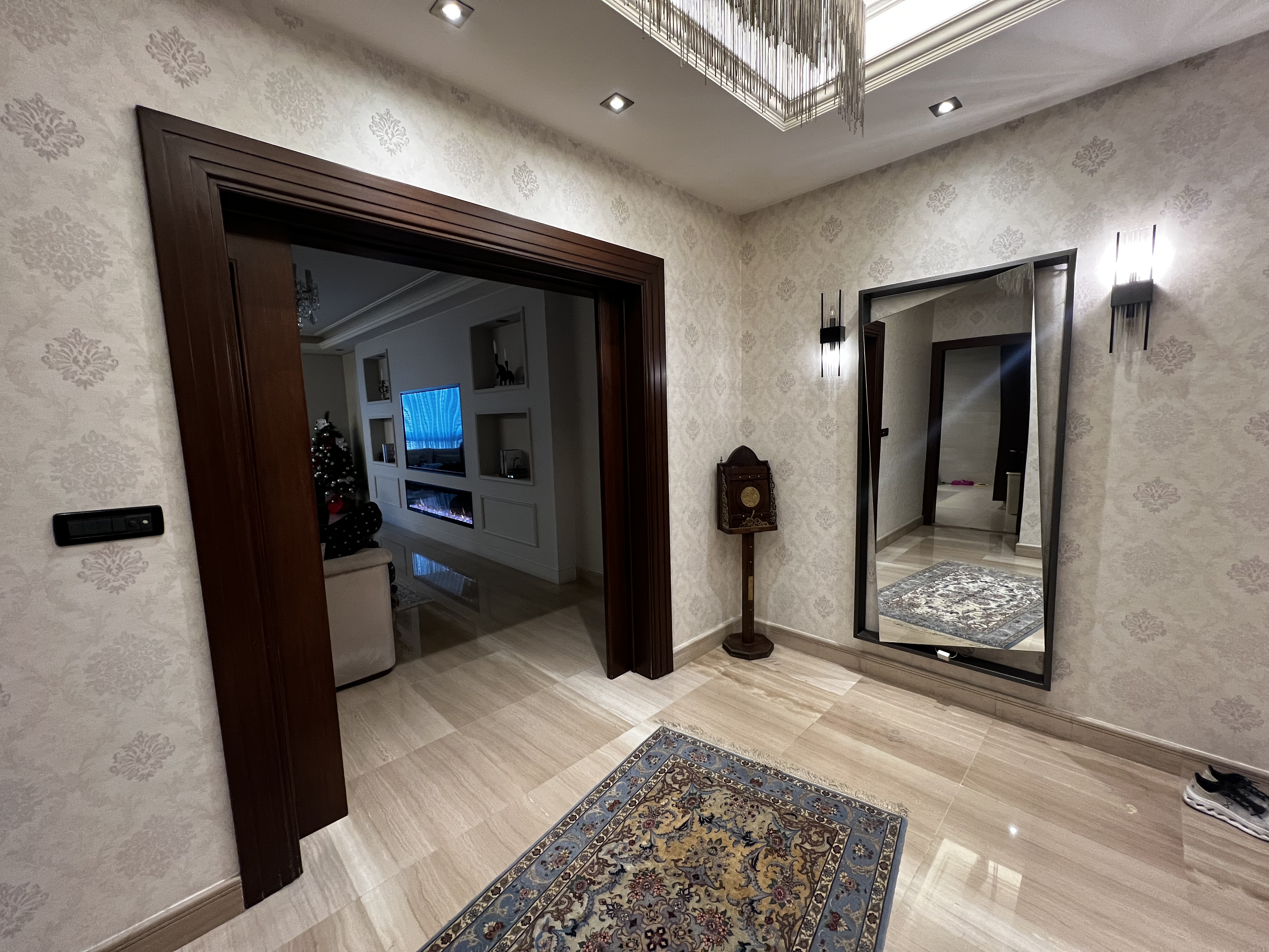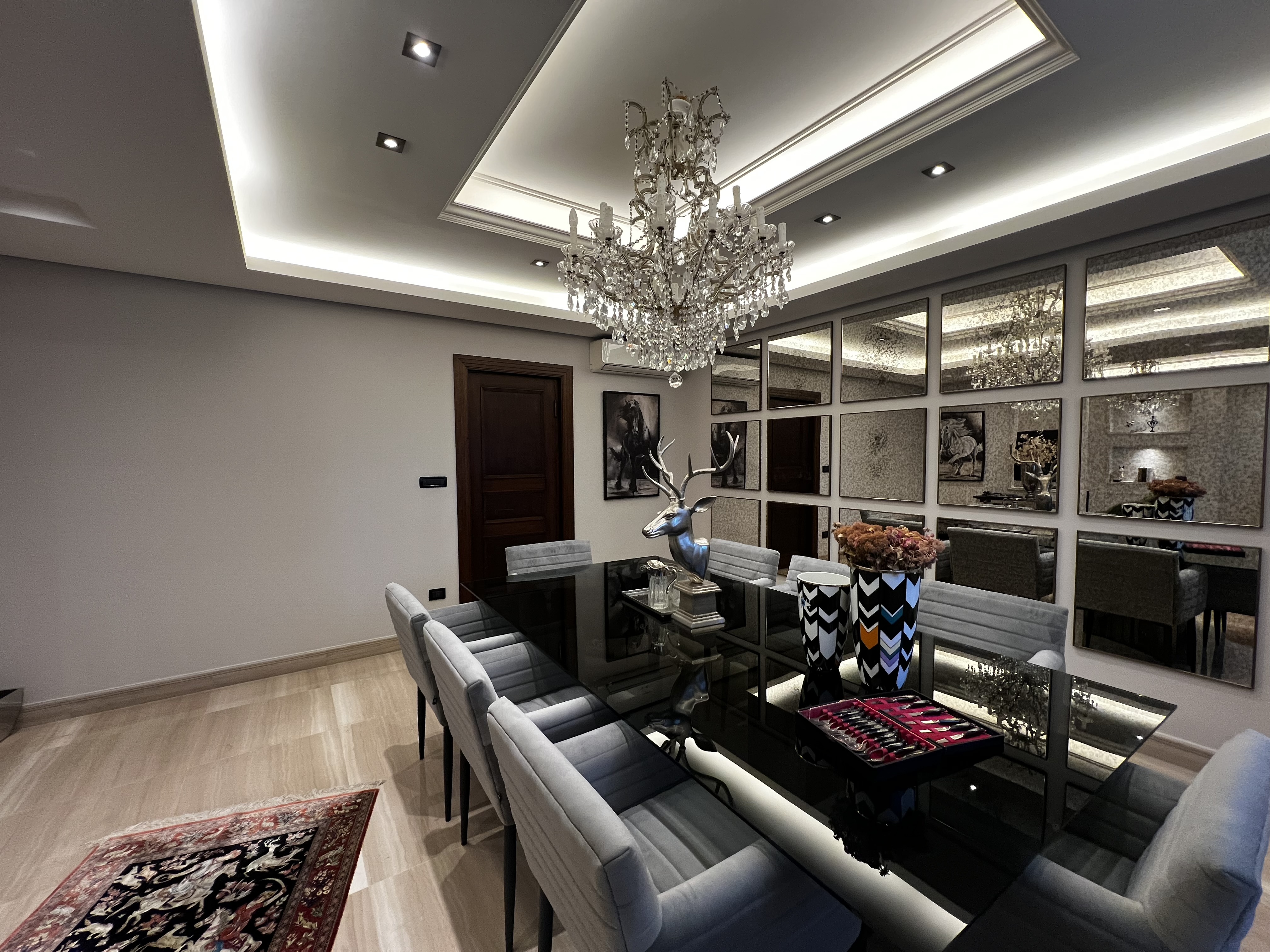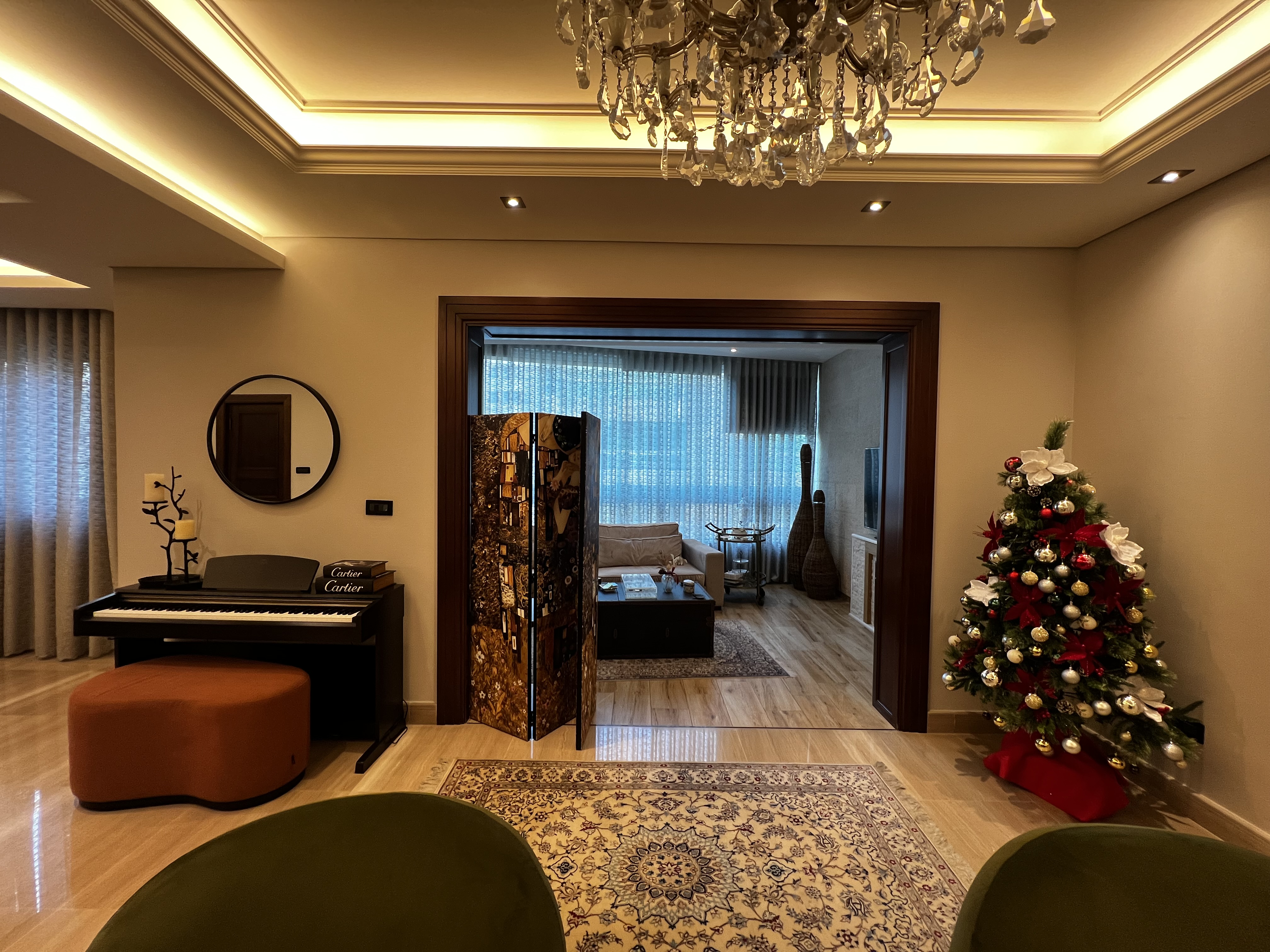 The apartment includes a well-designed kitchen, a large living room, a formal dining room, a TV room, and an additional sitting room, providing multiple areas for relaxation and entertaining. The layout is ideal for both family living and hosting guests.
