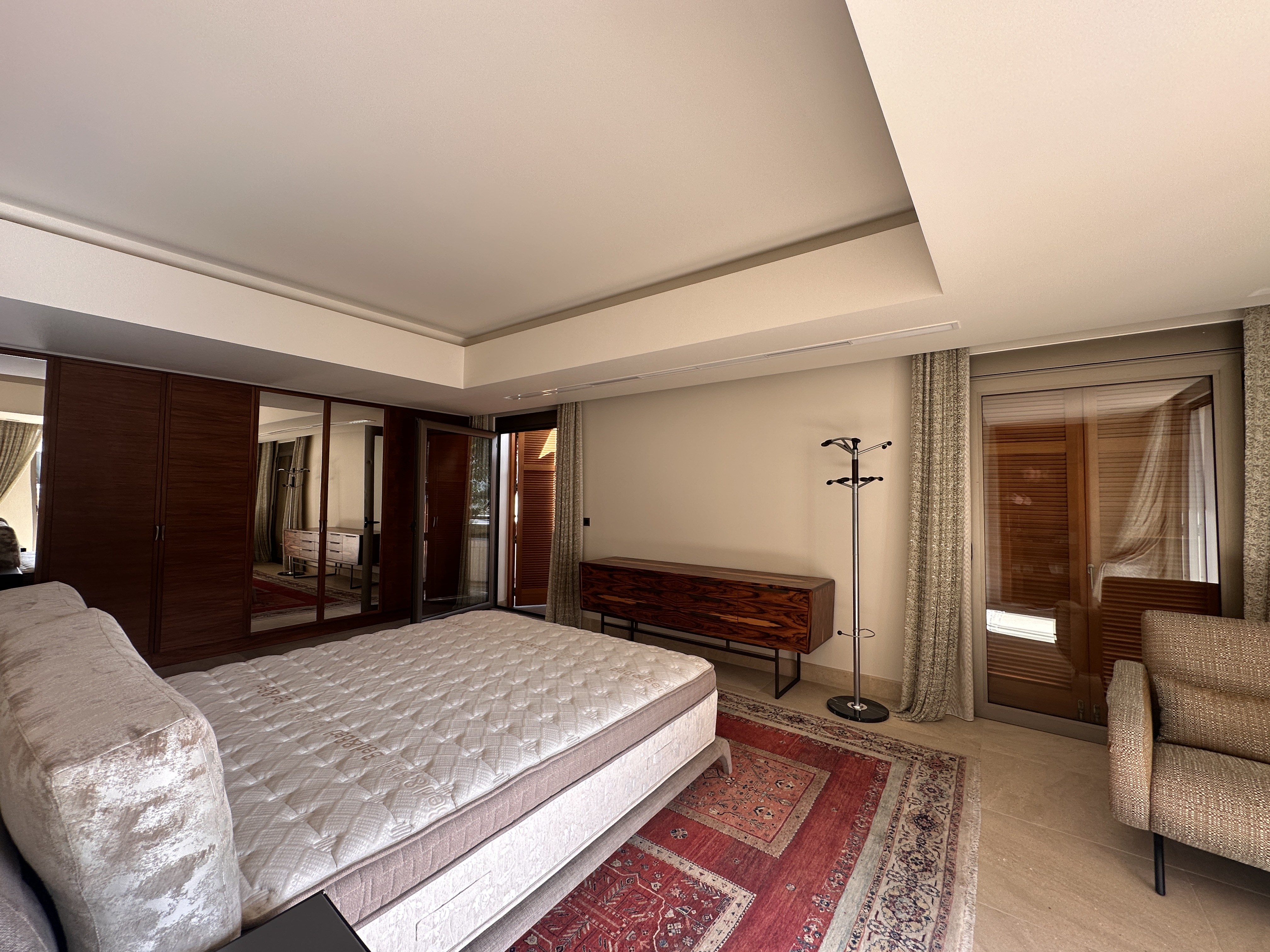 The residence features three master bedrooms, a bright salon with natural stone details, a modern kitchen, and open-plan living areas that flow seamlessly onto sunlit terraces perfect for entertaining or relaxing.