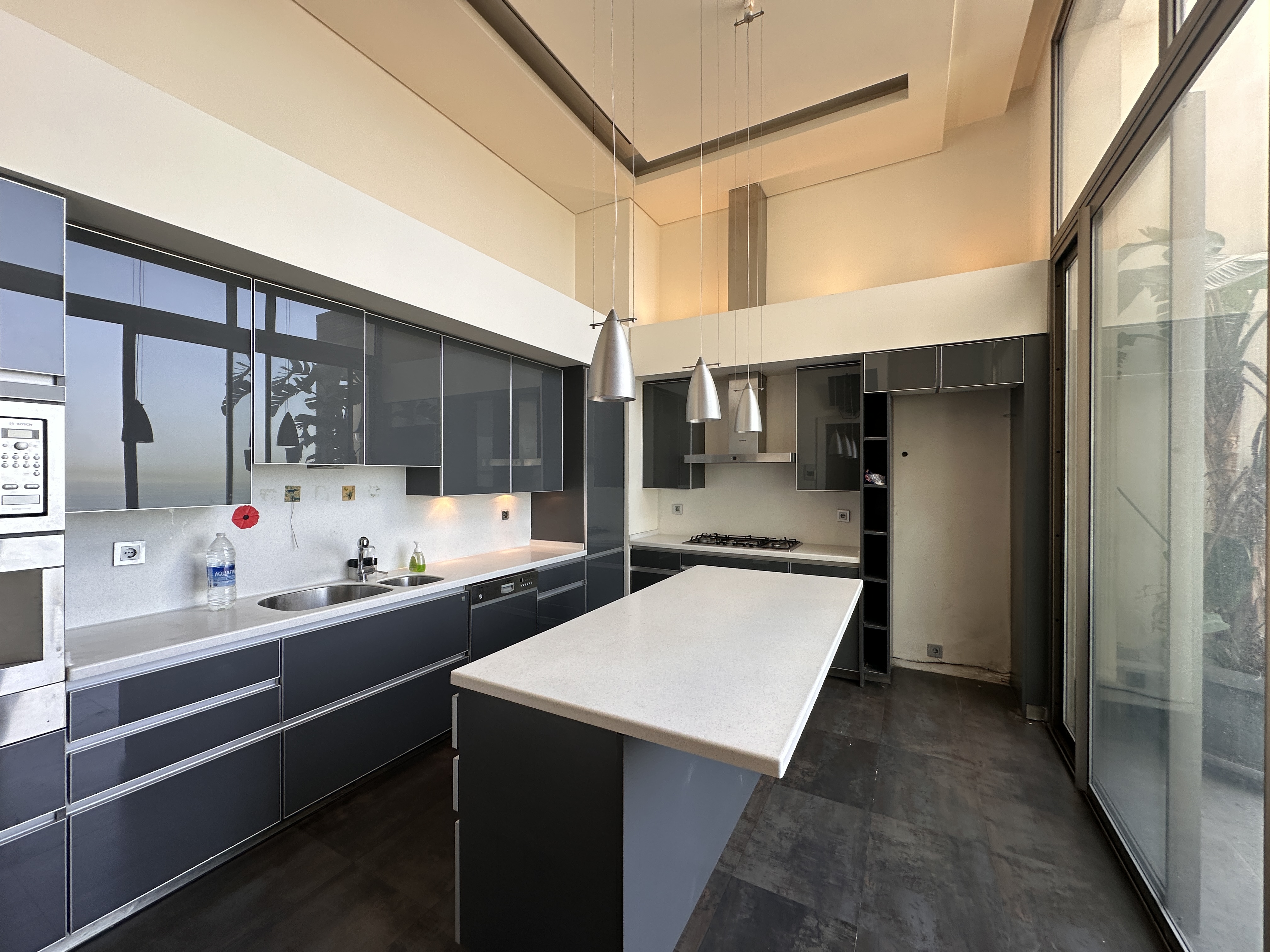 The apartment features double-height ceilings and panoramic full sea views. This unique residence offers three bedrooms, three bathrooms, a spacious open living area, modern kitchen, maid’s room, private terrace, and multiple balconies, combining contemporary design with airy, light-filled interiors.